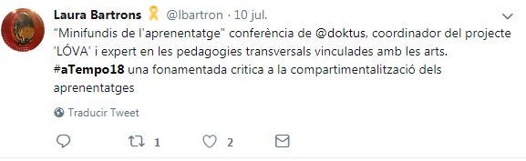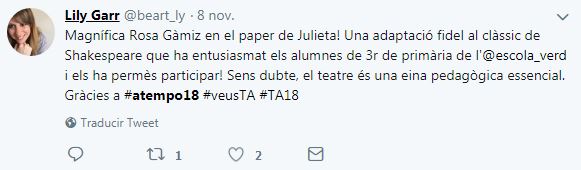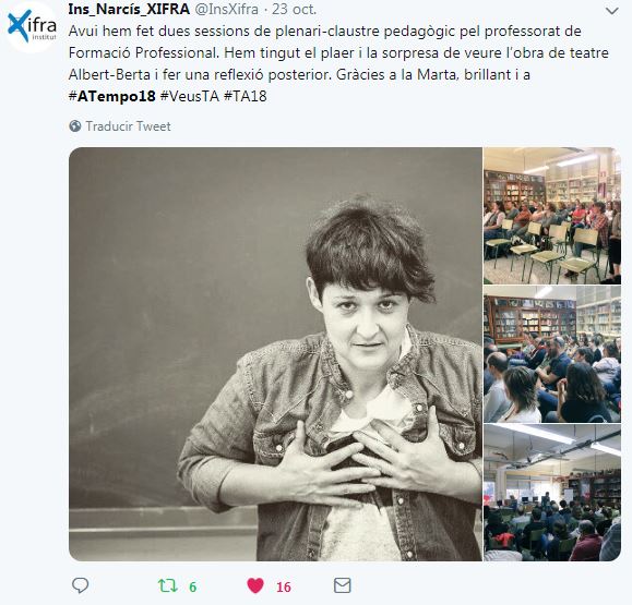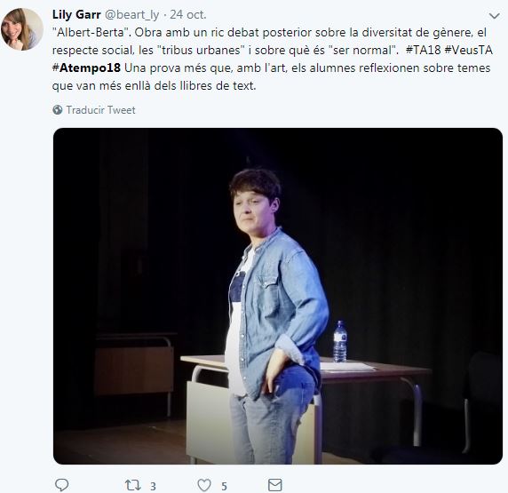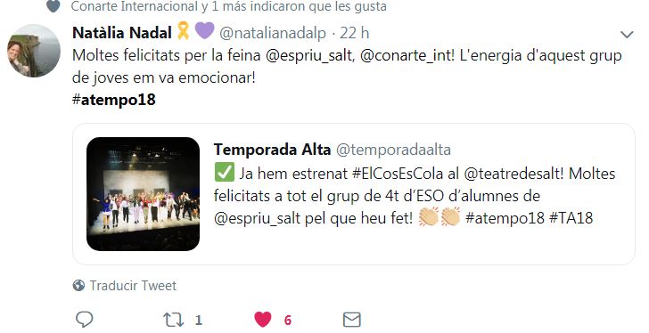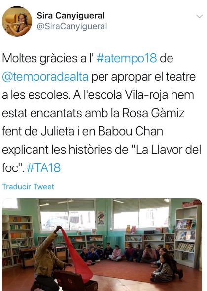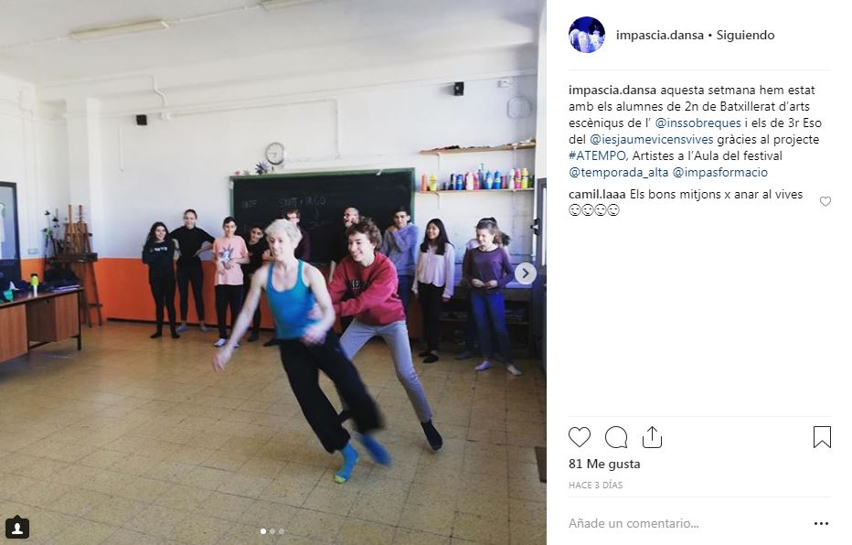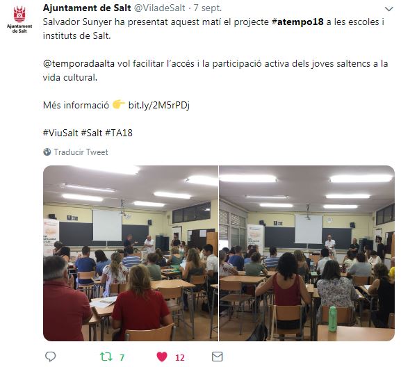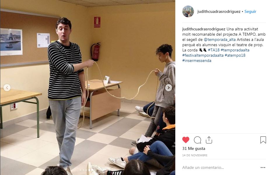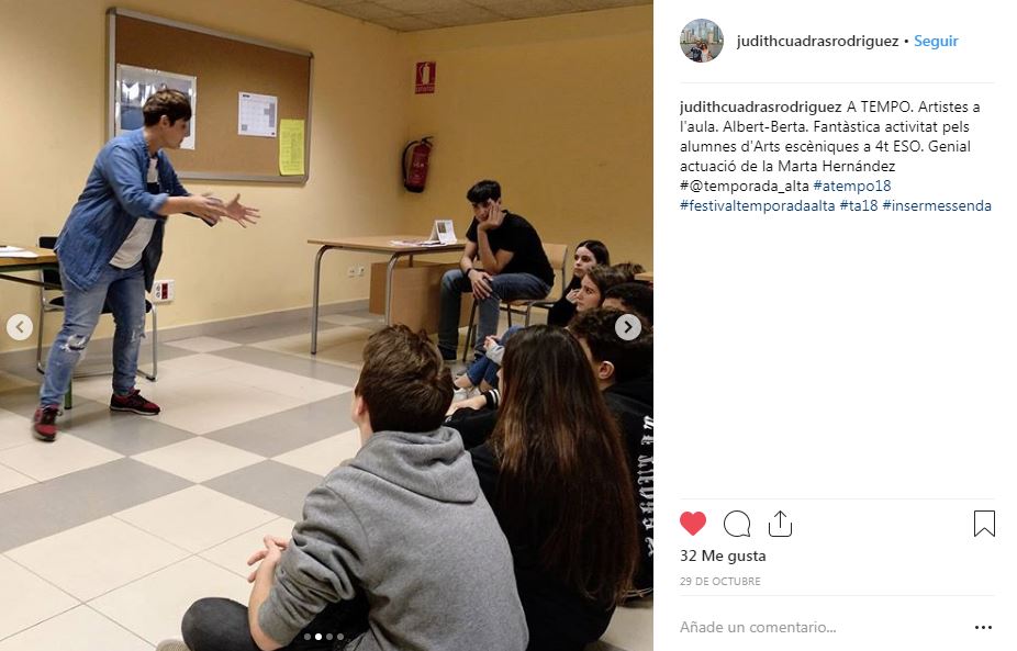 Si buscas la etiqueta #ATempo18 en tus redes sociales podrás encontrar los diferentes momentos de la segunda edición de A Tempo: el Seminariodirigido a docentes; Temporada Alta a l’Aula (una amplia programación artística dirigida a jóvenes y adultos, dentro y fuera de las aulas), Artistes a l’Aula (clases magistrales de artistas del Festival en las aulas de institutos y escuelas de Salt y Girona) y Crea el teu projecte, con Viatgesde l’Escola El Bosc de la Pabordia oEl Cos Es Cola de losestudiantes del Instituto Salvador Espriu.
